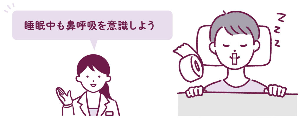 朝、目が覚めた時に喉がヒリヒリしたり、口がカラカラに乾いていたりしませんか?寝ているときの口呼吸が原因だったりします。口呼吸を続けていると、口腔内への悪影響だけでなく、睡眠の質が下がることで、体全体への負担になってしまうこともあります。日頃から鼻呼吸を意識しながら生活してみましょう。難しい方には、就寝時に使用するマウステープもあります。