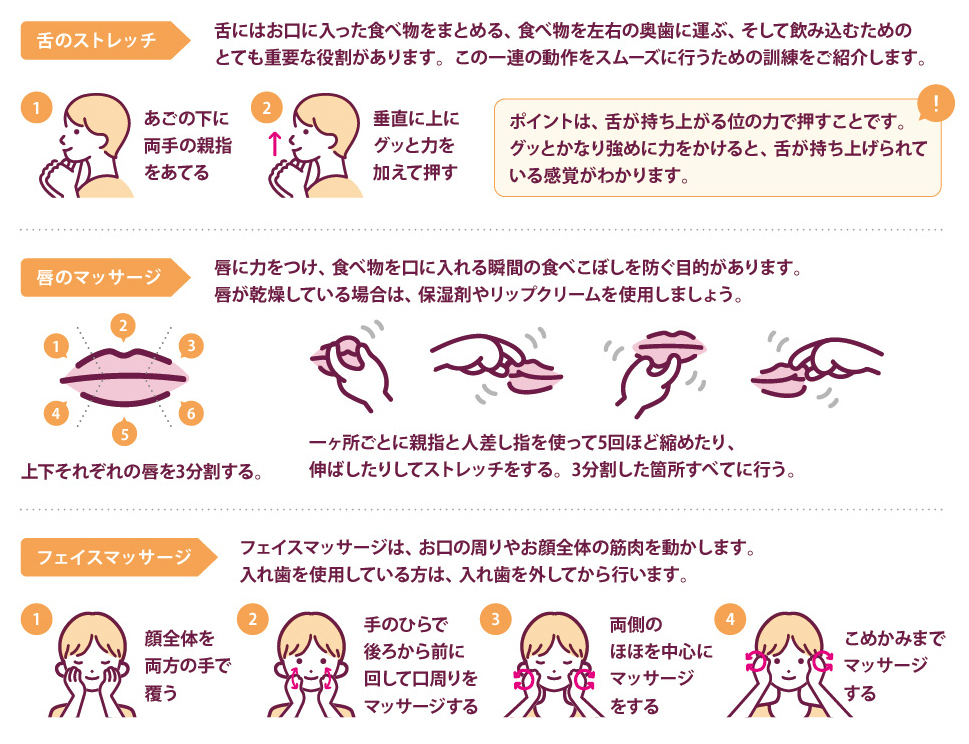口腔周囲筋ストレッチをしよう! 2025.06.20 歯とお口のお話し 筋肉は使わないでいると、だんだんと動きにくくなりますよね。お口も同じで、口腔周囲筋を使わないと、お口の働きが低下してしまいます。口腔周囲筋のストレッチで、意識的に動かす習慣がつくと、日々の生活が少しずつ変わるかもしれません。お口の働きの改善や誤嚥性肺炎の予防にもつながります。マッサージ感覚でも良いので、無理のない程度に一度、試してみてくださいね! 投稿者: tsujitesut 歯とお口のお話し スイカが登場!夏のはじまりです!前の記事
