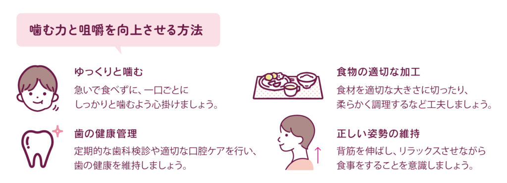 皆さんは『噛む』ということを意識したことがありますか? 咀嚼は、食べ物を消化しやすくするために重要です。食べ物を細かく砕くことで消化器官への負担を軽減し、栄養が効率的に吸収されます。また、唾液が分泌されることで食べ物の残りかすやバイ菌を洗い流し、虫歯や口臭の予防にもなります。さらに、咀嚼は脳に満腹感を伝え、過食を防ぐ効果もあります。