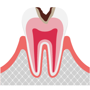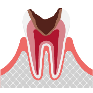 虫歯が象牙質まで進行すると、冷たいものがしみたり痛みを感じることがあります。治療は虫歯部分を削り、インレー(詰め物)で補います。広範囲の場合はクラウン(被せもの)が必要で、治療には複数回の通院が伴います。C2の虫歯は早期治療が重要です。