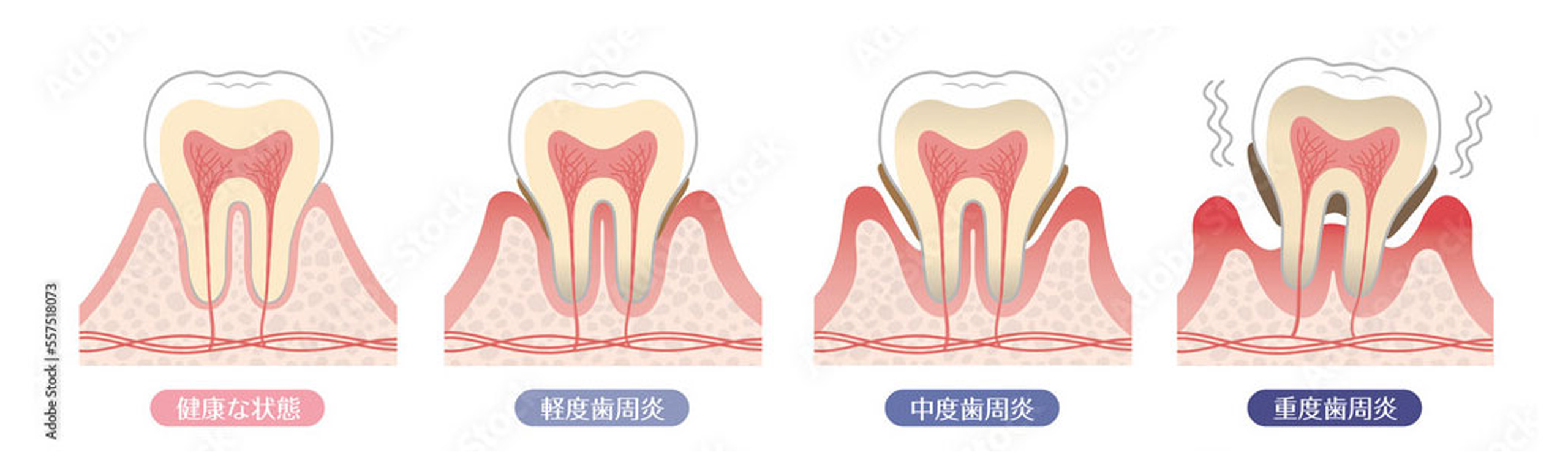 歯周病は、歯周ポケットにたまった歯垢内の細菌が原因で発症し、痛みのないまま進行する沈黙の病気です。重度になると歯を支える骨が溶け、最終的に歯が抜けることもあります。予防・早期発見・早期治療が重要で、当院では定期健診を推奨し、軽度から重度までの治療に対応。「自分の歯を残す」ことを大切にしています。